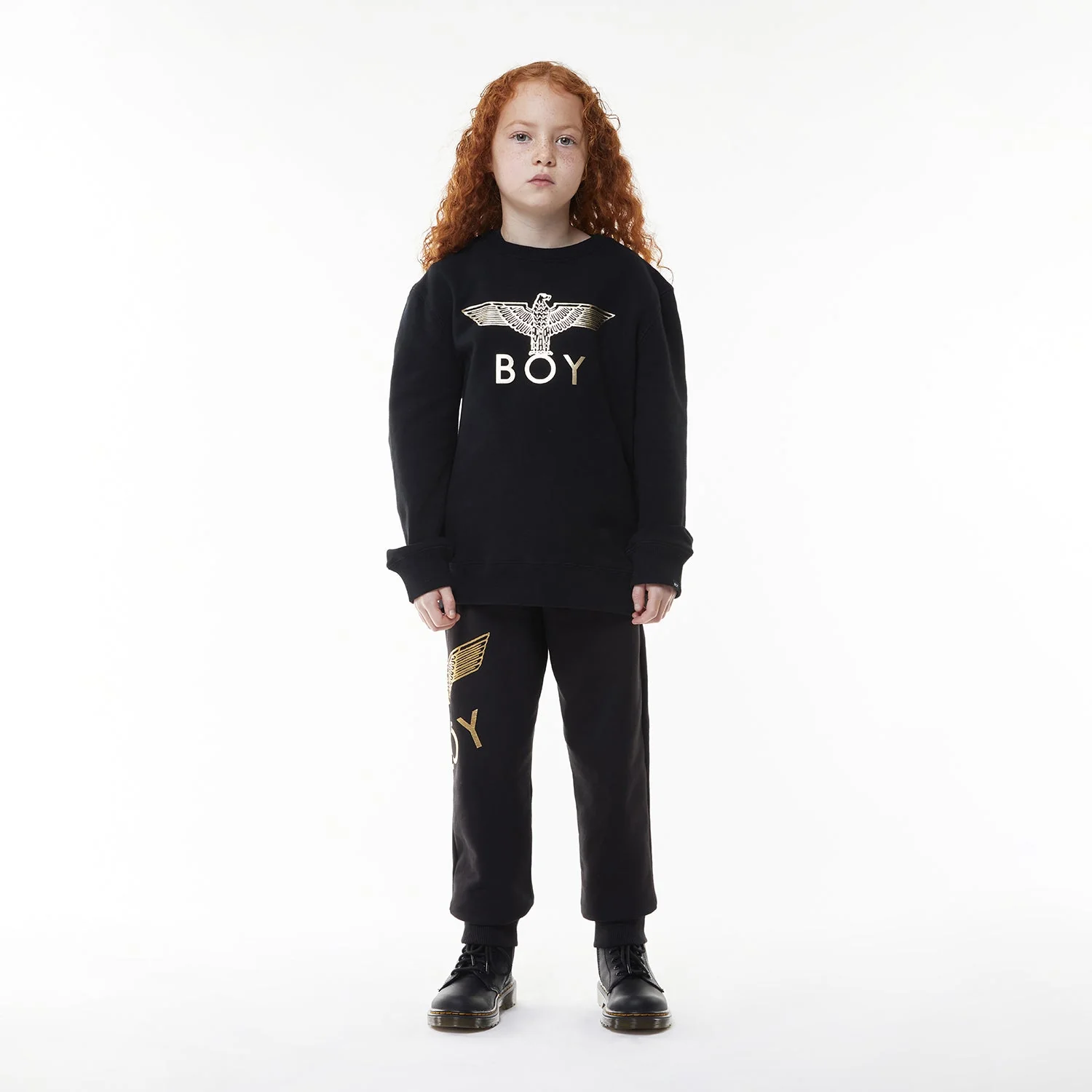 Introducing the BOY Eagle Kids Sweatshirt ā a stylish and comfortable essential from BOY LONDON. Crafted from 100% cotton, this unisex sweatshirt features the iconic BOY Eagle logo printed in gold on the chest, with a small logo tag on the seam. Ribbed cuffs and hem provide a snug fit, and it is available in black, white, and pink for versatile styling.