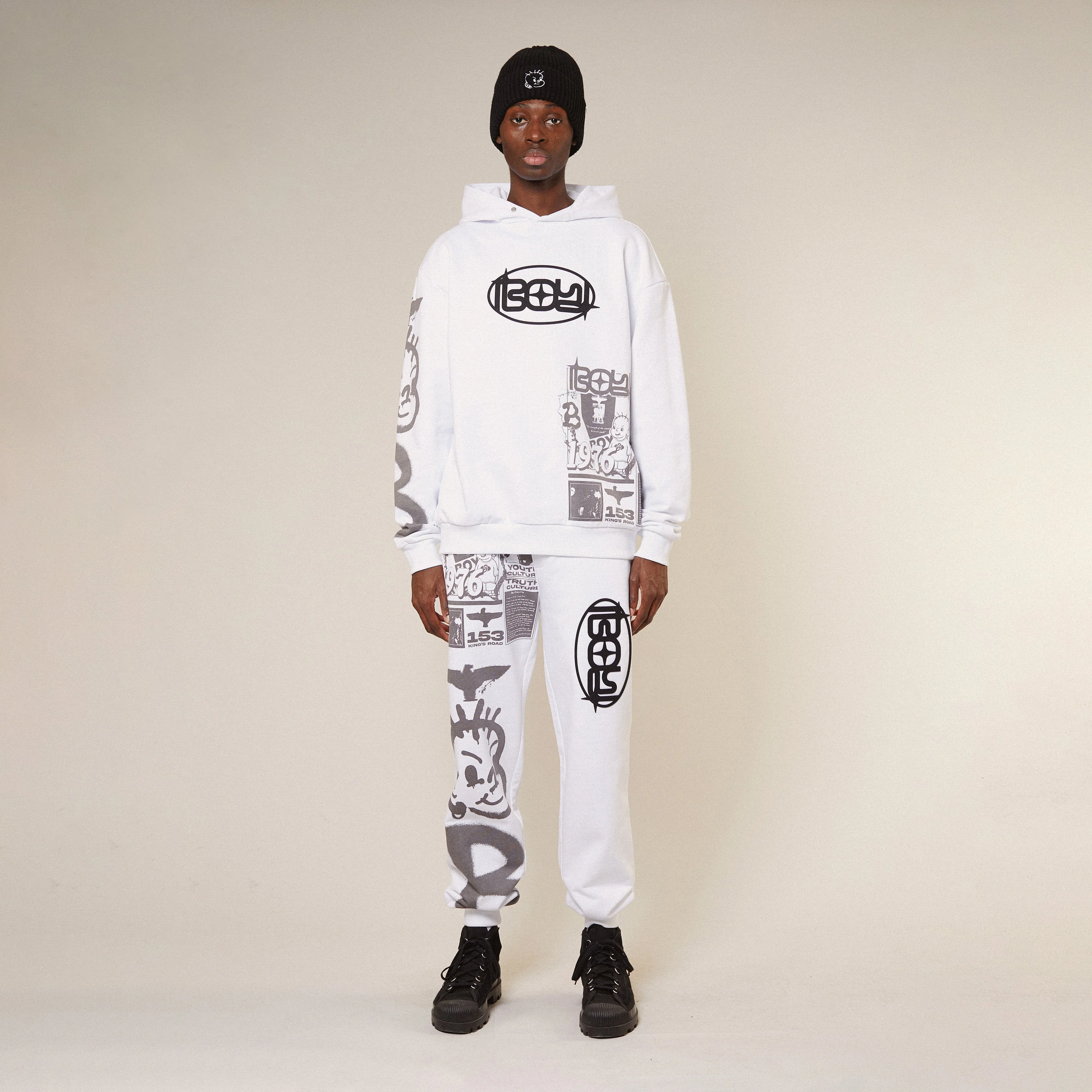 Introducing the Kings Road Graffiti Joggers — a bold streetwear essential crafted from 100% heavyweight cotton jersey for durability and all-day comfort. Featuring archival BOY LONDON graffiti graphics, these joggers deliver standout branding with modern streetwear styling. Designed with an oversized fit, they combine relaxed comfort with contemporary attitude, perfect for casual wear or layering.